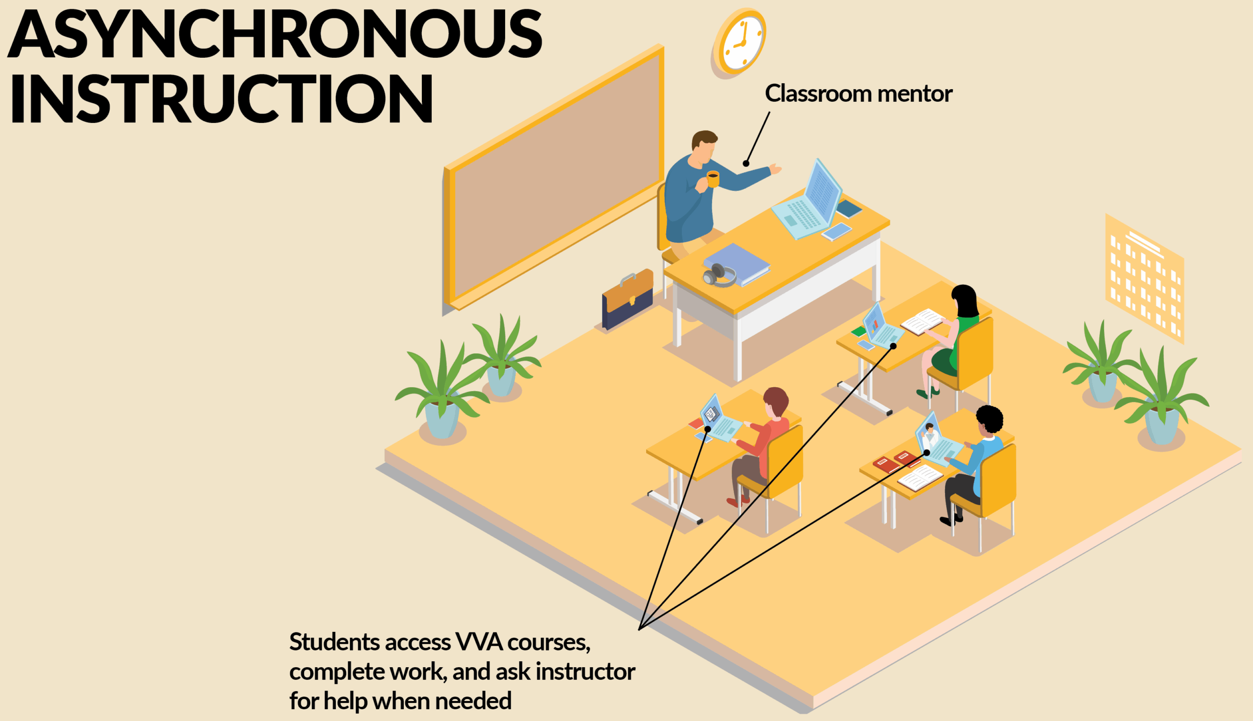 For asynchronous instruction of VVA courses in a school setting, students access their online courses, complete work, and ask their instructor for help. A mentor is present to support students and interact with the VVA instructor.